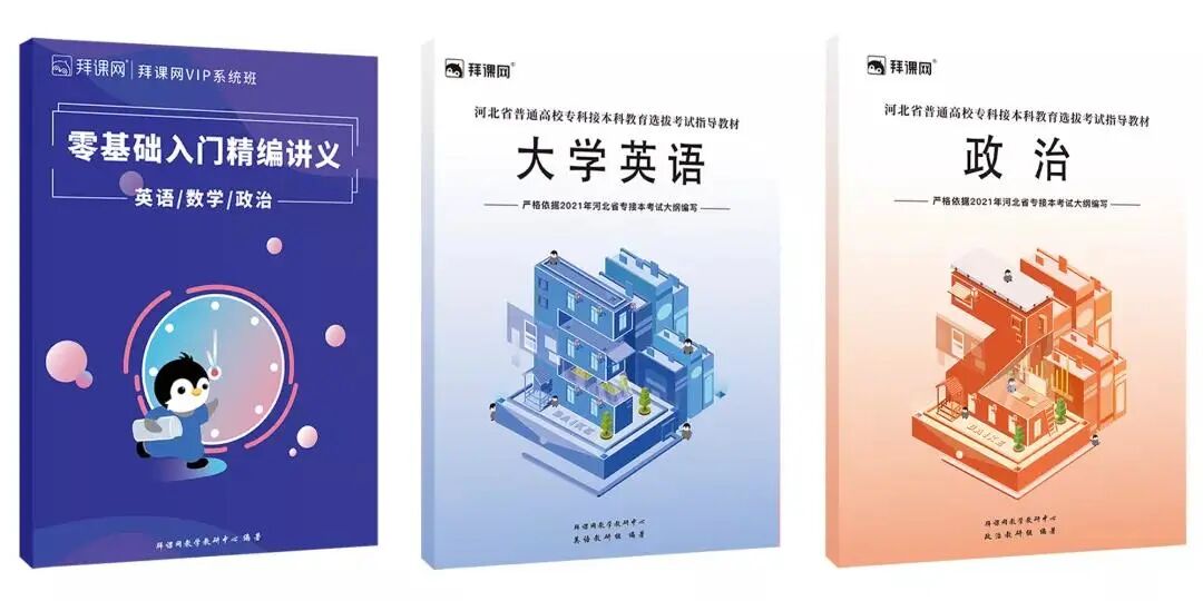 政治:《河北专接本公共课政治指导教材》拜课网集团自编教材(2022VIP系统班配套教材)《公共课零基础入门精编讲义(英语/数学/政治)》