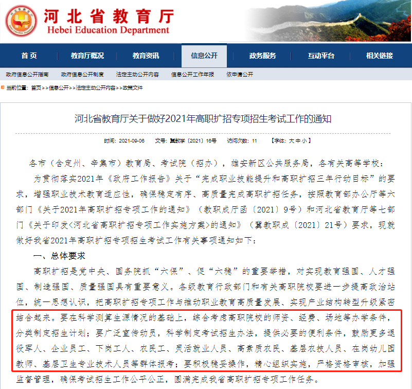 9月6日,河北教育厅发布了关于做好2021年高职扩招专项招生考试工作的通知,通知中主要说明了高职扩招的总体要求、工作任务以及保障措施等内容。